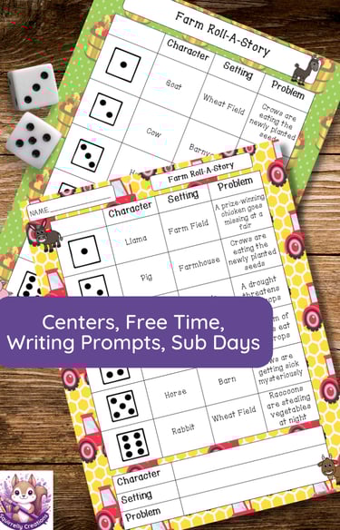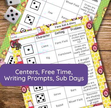 A super fun way to bring themed prompts into your classroom is with the Farm Roll-A-Story Activities. This awesome resource lets students craft their own farm-themed stories by rolling dice to decide key story elements, like: